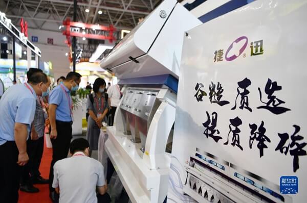 6月18日,在糧油產(chǎn)品及設(shè)備技術(shù)展區(qū),參展商展示智能云大米精選機。
