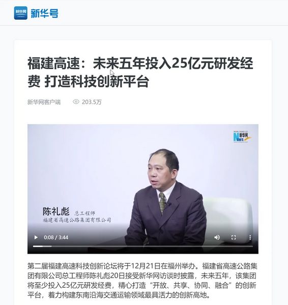 福建高速:未來五年投入25億元研發(fā)經(jīng)費 打造科技創(chuàng)新平臺