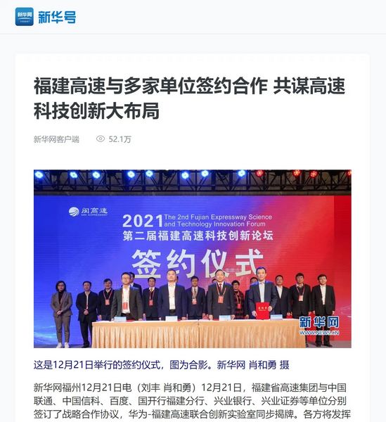 12月21日,福建省高速集團與中國聯(lián)通、中國信科、百度、國開行福建分行、興業(yè)銀行、興業(yè)證券等單位分別簽訂了戰(zhàn)略合作協(xié)議,華為-福建高速聯(lián)合創(chuàng)新實驗室同步揭牌。各方將發(fā)揮優(yōu)勢,聚合資源,為福建高速科技創(chuàng)新賦能。
